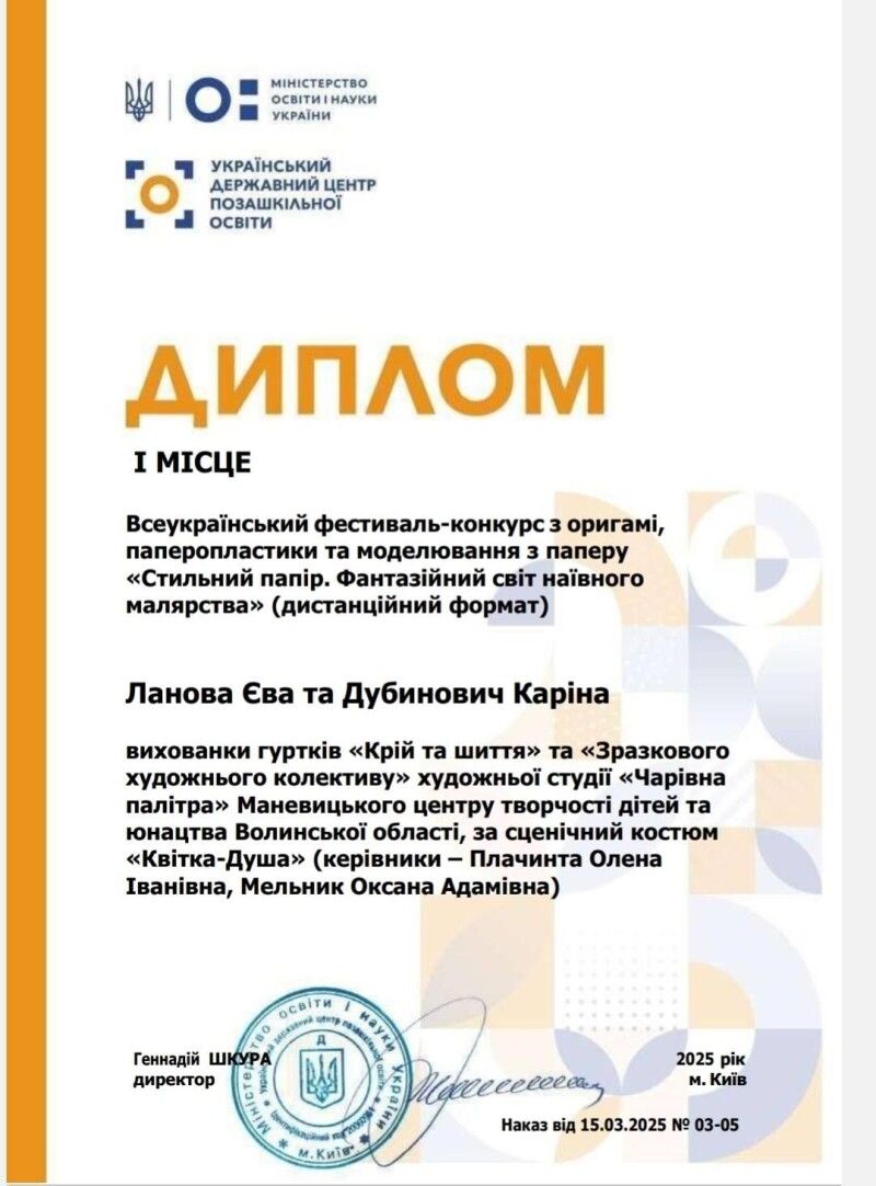 «Знову маємо перемогу у Всеукраїнському фестивалі-конкурсі з оригамі, паперопластики та моделювання з паперу «Стильний папір. Фантазійний світ наївного малярства» (дистанційний формат), що проходив у м. Львів. Яскравий образ, майстерно втілений у сценічному костюмі «Квітка-Душа» не зміг залишити байдужими членів журі», – йдеться у повідомленні.