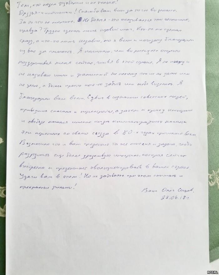 Український режисер Олег Сенцов, який відбуває 20-річний термін ув'язнення в колонії на російському Півночі, звернувся до всіх, хто його підтримує і домагається його звільнення