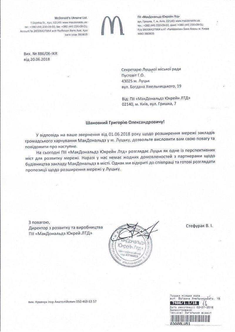 Тож на звернення міської ради до представників компанії щодо достовірності озвученої інформації, директор з розвитку та виробництва ПІІ “МакДональдз Юкрейн ЛТД” Стефурак В.І. повідомив, що на сьогодні Луцьк розглядають як одне із перспективних міст для розвитку мережі.