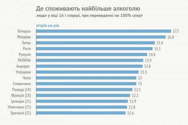У підсумку, топ-10 країн за вживанням алкоголю має такий вигляд: Білорусь, Молдова, Литва, Росія, Румунія, УКРАЇНА, Андорра, Угорщина, Чехія і Словаччина. Важливо розуміти, що для рейтингу були враховані люди у віці 16+ і кількість легально проданого алкоголю.