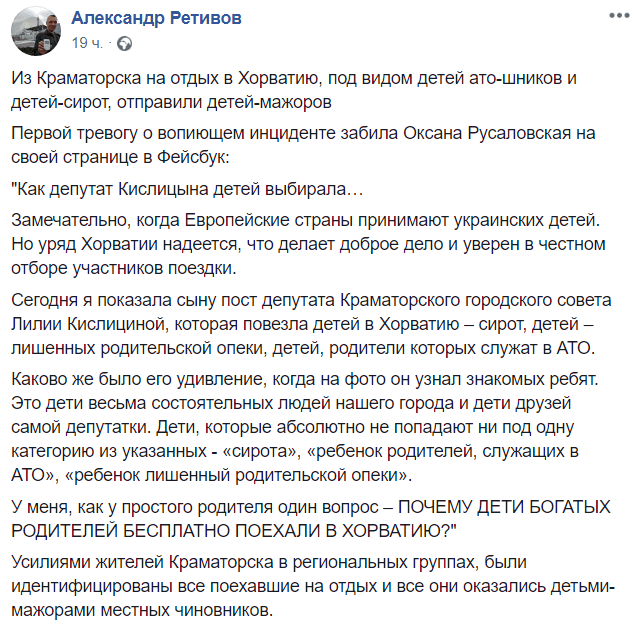 “Чудово, коли європейські країни беруть українських дітей. Але уряд Хорватії сподівається, що робить добру справу і впевнене в чесному відборі учасників поїздки. Я показала синові пост депутата Краматорської міської ради Лілії Кисліциній, яка повезла дітей до Хорватії – сиріт, дітей, позбавлених батьківського опіки, дітей, батьки яких служать в АТО. Яке ж було його здивування, коли на фото він впізнав знайомих хлопців. Це діти дуже заможних людей нашого міста і діти друзів самої депутатки. Діти, які абсолютно не потрапляють ні під одну категорію із зазначених – “сирота”, “дитина батьків, службовців в АТО”, “дитина, позбавлена батьківського піклування”, – зазначила вона на своїй сторінці в Facebook.
