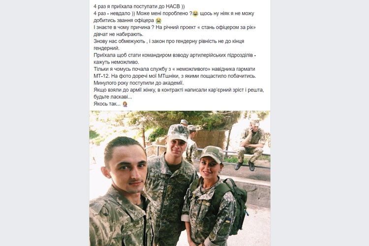 «Знову нас обмежують, і закон про гендерну рівність не до кінця гендерний. Приїхала щоб стати командиром взводу артилерійських підрозділів – кажуть неможливо. Тільки я чомусь почала службу з «неможливого» навідника гармати МТ-12», – зазначила вона.
