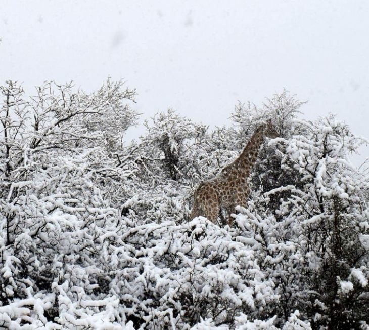 Мова про Капську провінцію Південно-Африканської Республіки. На неї нагрянув надпотужний холодний фронт, який супроводжувався рясним снігопадом. І ось уже два дні, як ціла планета з інтересом розглядає дивовижні фото: у снігу борсаються слони, жирафи та інші представники цього найспекотнішого континенту. Ці мешканці саван явно вперше в житті зіткнулись із таким явищем.