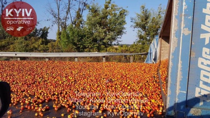 За даними Київ Оперативний, на 120-му км траси з фури випали тонни яблук просто на дорогу, пише "НВ".