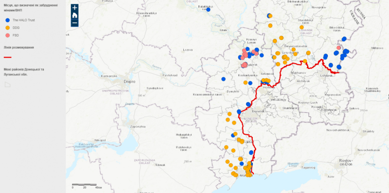 Інформаційна мапа розмішена на офіційному веб-сайті Міноборони у розділі «Протимінна діяльність». Інтерактивну карту можна переглянути за цим посиланням. На карті маркуються забруднені мінами чи снарядами території не лише Донецької та Луганської областей. Так, на мапі зазначається ділянка біля м. Балаклія (Харківська область). Дата обстеження ділянки - 29 вересня 2017 року, а її статус позначений як «Обстежена (очікує розмінування)». Нагадаємо, що ОБСЄ закликало приступити до невідкладного та повного гуманітарного розмінування населених пунктів та пунктів пропуску на Донбасі. Вартість розмінування всього Донбасу може сягнути $ 800 млн.
