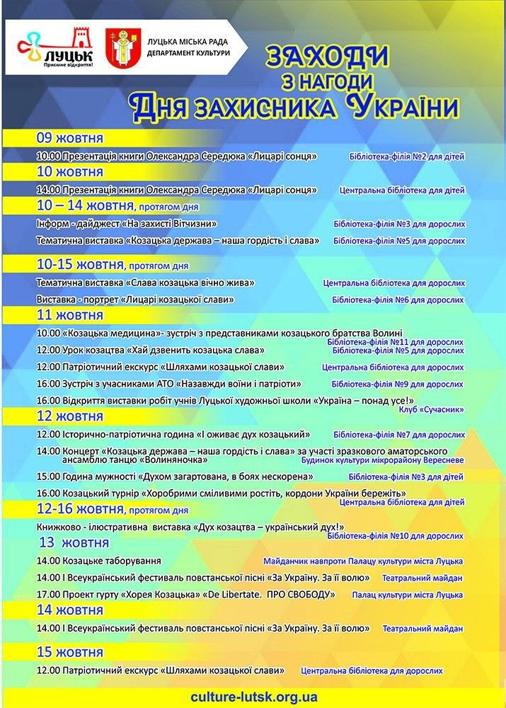 Афіша розваг Луцька Культура 10.10.2018, 14:06 Заходи до Дня захисника України Для лучан та гостей міста заклади культури підготували святкову програму