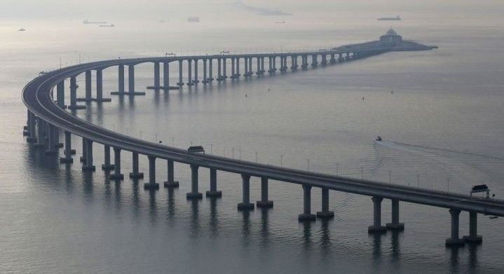 Загальна протяжність моста — 55 кілометрів (на фото). Його будівництво почалося ще у 2009 році, а закінчитися мало у 2016-му, але внаслідок перегляду бюджету, несприятливих погодних умов, аварій і нещасних випадків роботи затягнулися.