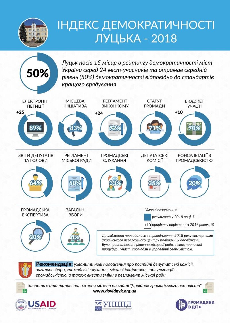 Серед 24 міст-учасників луцьк отрмав середній рівень - 50% демократичності відповідно до стандартів кращого самоврядування.