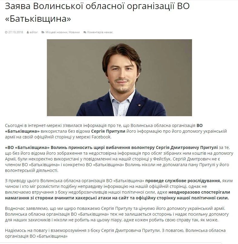 «ВО «Батьківщина» Волинь приносить щирі вибачення волонтеру Сергія Дмитровичу Притулі за те, що без його відома його зображення та недостовірна інформація про обсяг зібраних ним коштів на допомогу Армії, були некоректно використані у повідомленні на нашій сторінці у Facebook. Сергій Дмитрович не є членом ВО «Батьківщина» і конкретно ВО «Батьківщина» Волинь ніколи не допомагала пану Притулі у його волонтерській діяльності», – йдеться у заяві.