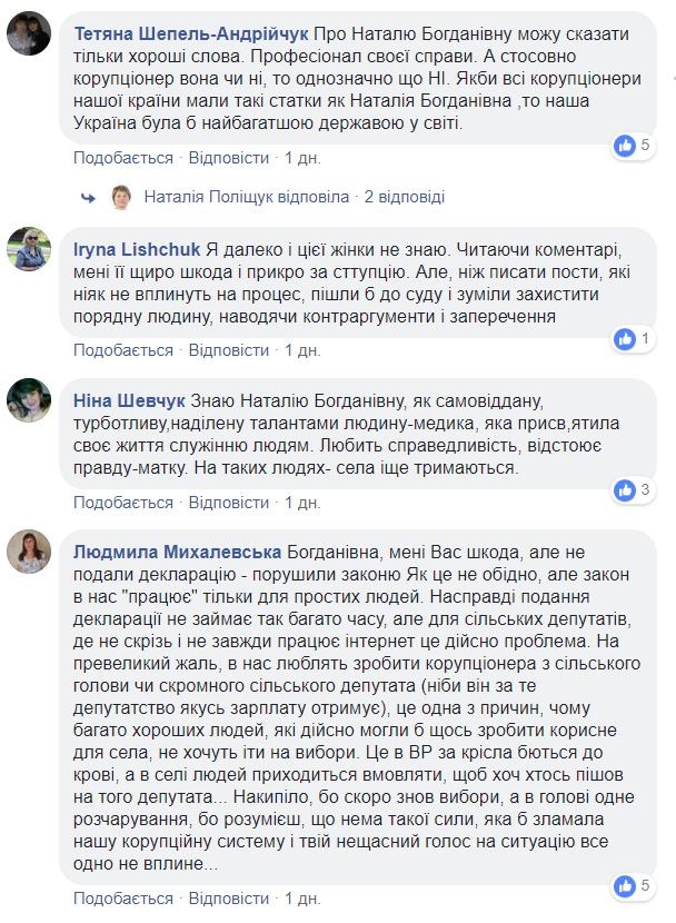 Таких фактів безліч, адже хтось повинен бути корупціонером, якщо більше нікого знайти не можна. Тому і представники силових структур сьогоднішньої влади шастають по знищених владою селах, де люди рахують кожну копійку та вишукують таких прекрасних людей, як Наталія Поліщук, які є патріотами України, вболівають за людей та державу, які на початку війни віддали все, щоб наші хлопці мали чим воювати з російським агресором, якого своїми діями запустили сюди ті, хто був і далі залишається при владі. Сумно, але це на сьогодні реалії життя, а тому людям потрібно, взявши в руки виборчий бюлетень, добре його вивчити і на майбутніх виборах зробити єдиний для себе, своїх дітей, внуків та правнуків - правильний вибір, щоб більше в нашій країні, сільського фельдшера, авторитетну людину в селі, яка за рахунок свого здоров'я та особистих коштів рятує хворих, ніколи не звинувачували в корупції .