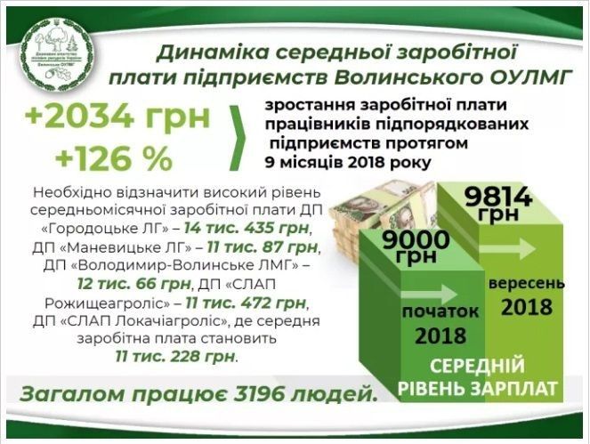 Протягом 9 місяців 2018 року заробітна плата працівників підпорядкованих підприємств зросла на 2034 грн або 126%. Її середній рівень становить 9814 грн. На початку року цей показник становив 9000 грн.