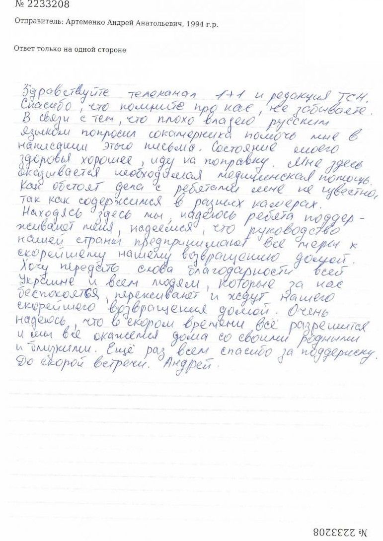 «Доброго дня телеканал 1+1 та редакція ТСН. Дякую, що пам'ятаєте про нас, не забуваєте. У зв'язку з тим, що погано володію російською мовою, попросив співкамерника допомогти мені у написанні цього листа. Стан мого здоров'я добрий, іду на поправку. Мені тут надають необхідну медичну допомогу. Який стан справ у хлопців, мені не відомо, оскільки утримуємось у різних камерах. Перебуваючи тут, думаю хлопці мене підтримають, сподіваємось, що керівництво нашої країни вживає всіх заходів для найшвидшого нашого повернення додому. Хочу передати слова вдячності всій Україні і всім людям, які про нас непокоються, переживають та чекають нашого найшвидшого повернення додому. Дуже сподіваюсь, що найближчим часом все вирішиться і ми всі опинимось вдома зі своїми близькими. Ще раз всім дякую за підтримку. До скорої зустрічі. Андрій».