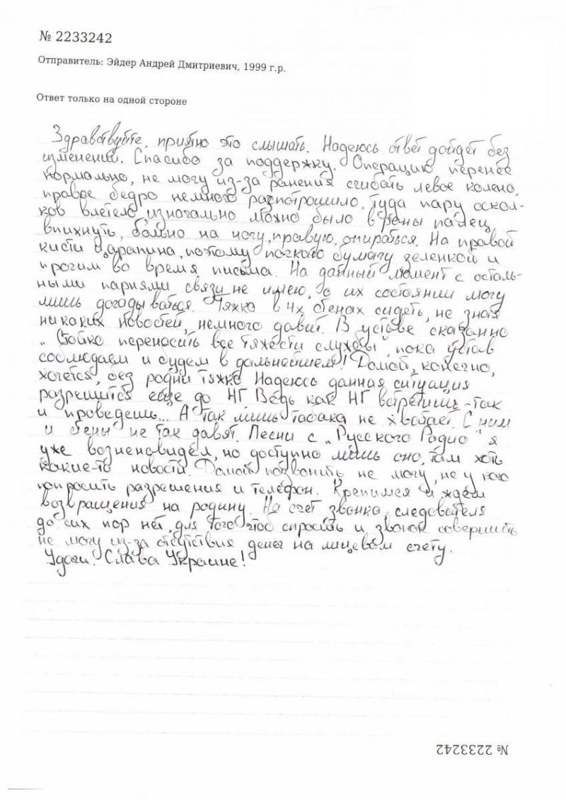 «Доброго дня, приємно це чути. Сподіваюсь, відповідь буде без змін. Дякую за підтримку. Операцію переніс нормально, не можу через поранення згибати ліве коліно, праве стегно трохи розпотрошило. Туди пару уламків влетіло, спочатку можна було в рани палець всунути, боляче на ногу праву спиратись. На правій руці подряпина, тому мажу папір зеленкою та іншим під час написання. Наразі з іншими хлопцями зв'язку не маю. Про їхній стан можу лише здогадуватись. Важко в чотирьох стінах сидіти і не знати жодних новин, трохи тисне. В уставі сказано «стійко переносити всі тяжкості служби». Поки устав виконуємо і будемо й надалі! Додому, звичайно, хочеться, без рідних тяжко. Сподіваюсь, ця ситуація вирішиться ще до Нового року, адже як НГ зустрінеш, так його і проведеш. А так лише тютюну не вистачає. З ним і стіни не так давлять. Пісні з «Русского радио» я вже зненавидів, але доступно лише воно. Там хоч якісь новини. Додому зателефонувати не можу, нема у кого попросити дозвіл та телефон. Тримаємось та чекаємо повернення на батьківщину. З приводу дзвінка — слідчого досі немає для того, щоб спитати, та дзвінок здійснити не можу, бо немає коштів на рахунку. Удачі. Слава Україні!»