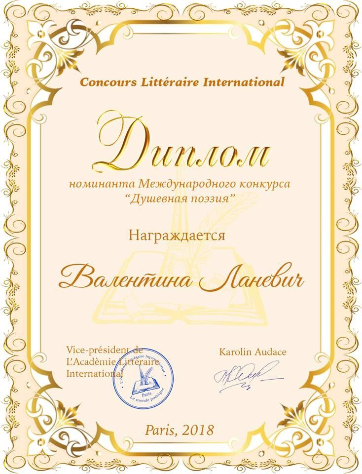 І ось нова приємна звістка: поетесу з Любешіва відзначили дипломом міжнародного літературного конкурсу в Парижі. Про це Валентина Ланевич повідомила на своїй сторінці у Facebook.