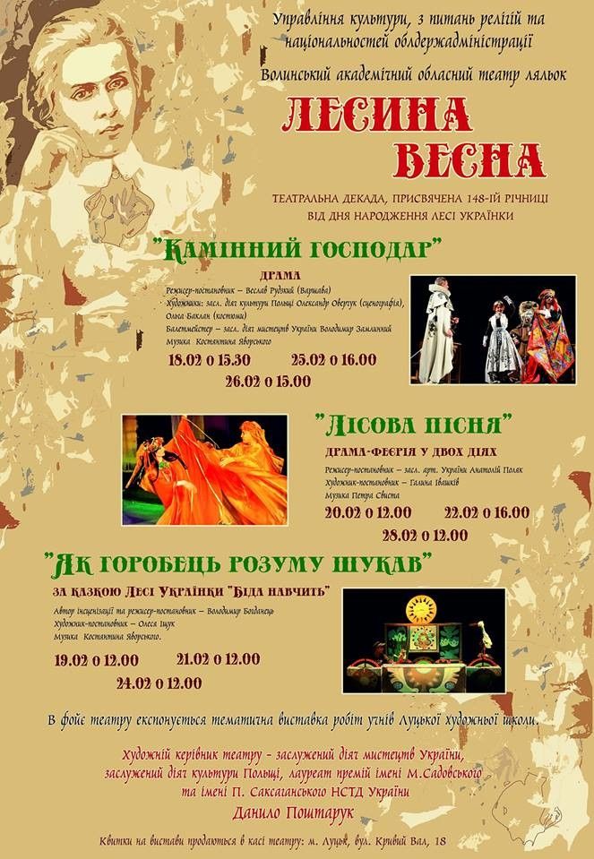 Протягом 10 днів, присвячених 148-річниці від дня народження геніальної Лесі Українки, можна ознайомитися із найяскравішими драматичними творами поетеси в професійній постановці майстрів Волинського академічного обласного театру ляльок