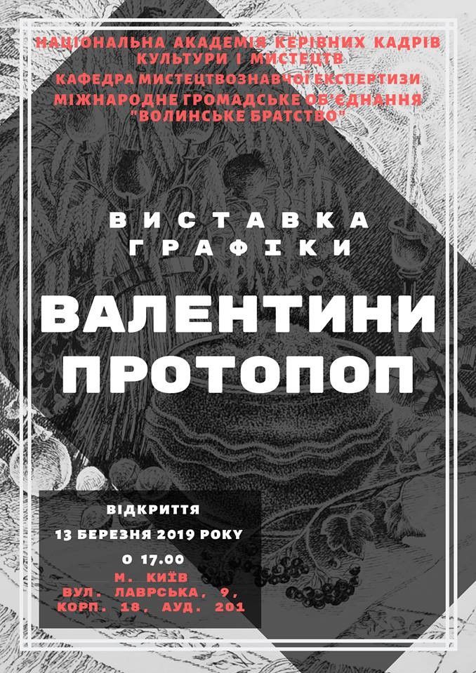 Кафедра мистецтвознавчої експертизи Національної академії керівних кадрів культури і мистецтв та Міжнародне громадське об'єднання "Волинське братство" щиро запрошують на відкриття виставки графічних робіт майстрині з Волині Валентини Протопоп, яке відбудеться 13 березня о 17.00.