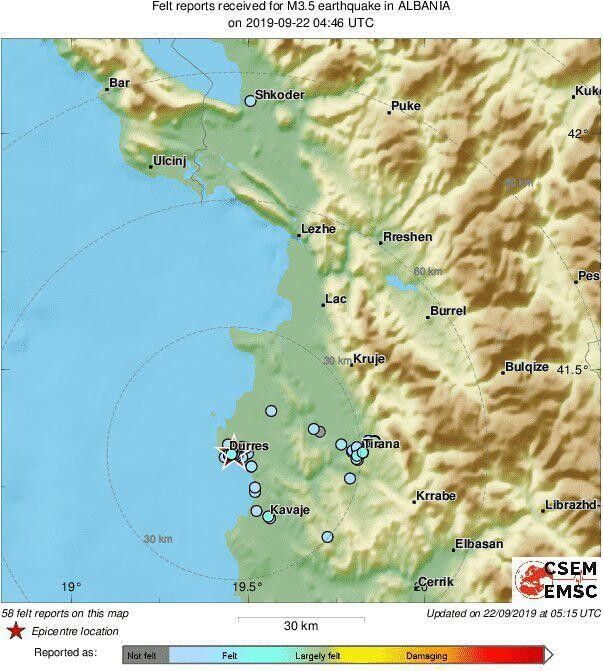 Магнітуда підземних поштовхів становила 5,8. Епіцентр землетрусу розташовувався недалеко від портового міста Дуррес, приблизно в 60 кілометрах на північний захід від столиці країни Тирани. Осередок залягав на глибині 10 кілометрів.