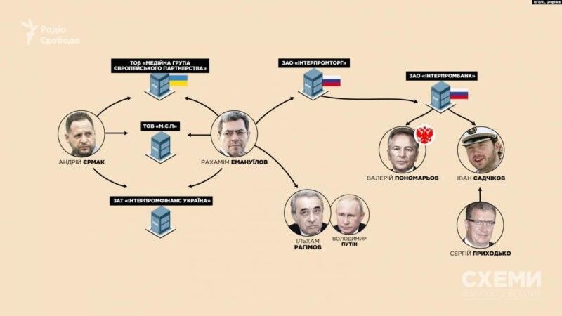 «Бізнес-партнер Андрія Єрмака Рахамім Емануїлов через російський «Інтерпромбанк» має зв’язки із «єдиноросом» і сенатором Камчатки Пономарьовим, зятем першого заступника керівника апарату уряду Росії Приходька, а через релігійну общину — із однокурсником президента Росії Володимира Путіна. При цьому Андрій Єрмак — помічник українського президента Зеленського, його повірений з міжнародних справ та головний переговорник між Україною та Росією», — йдеться у розслідуванні. Журналісти непокояться, що у цьому може бути потенційний конфлікт інтересів.