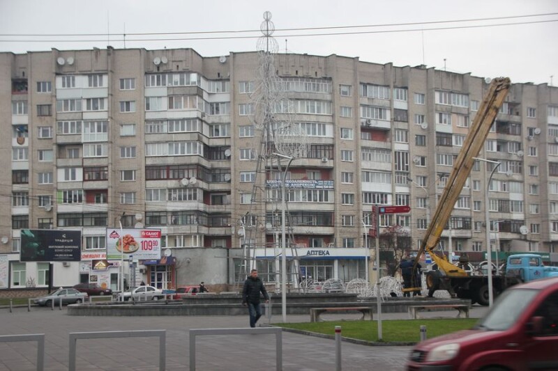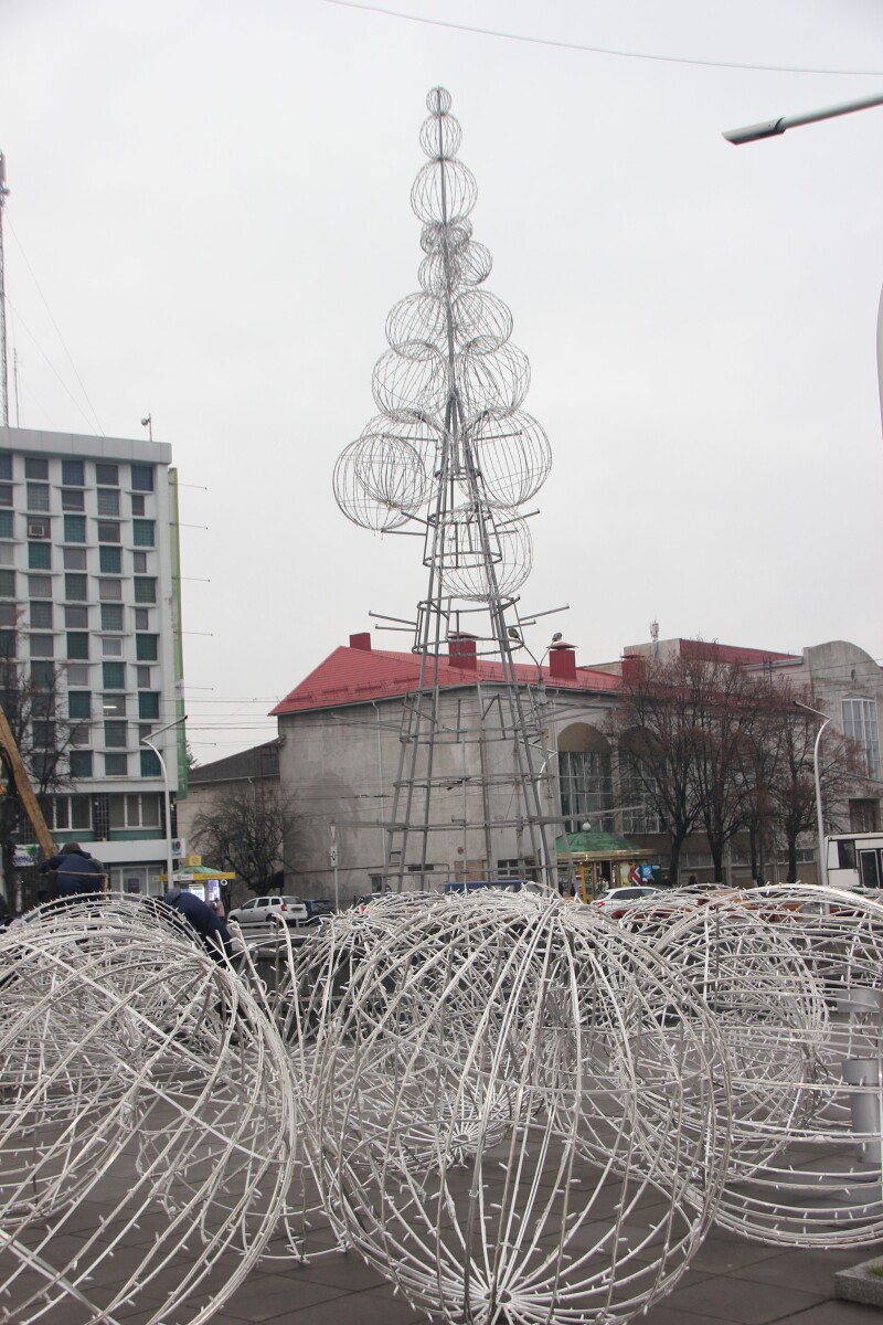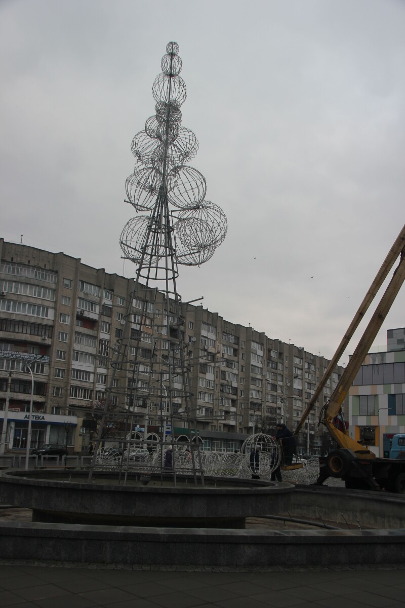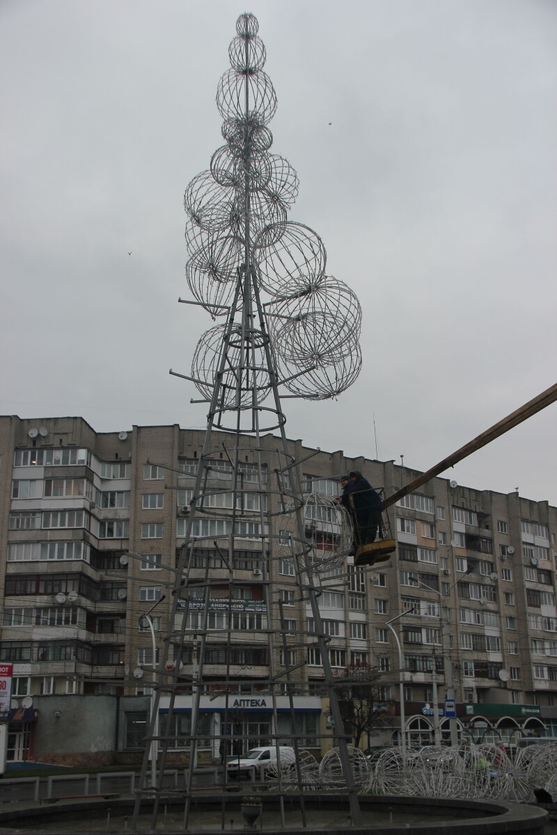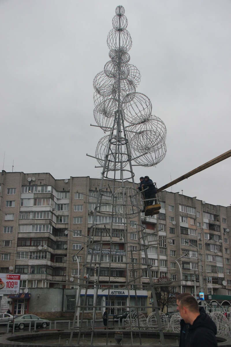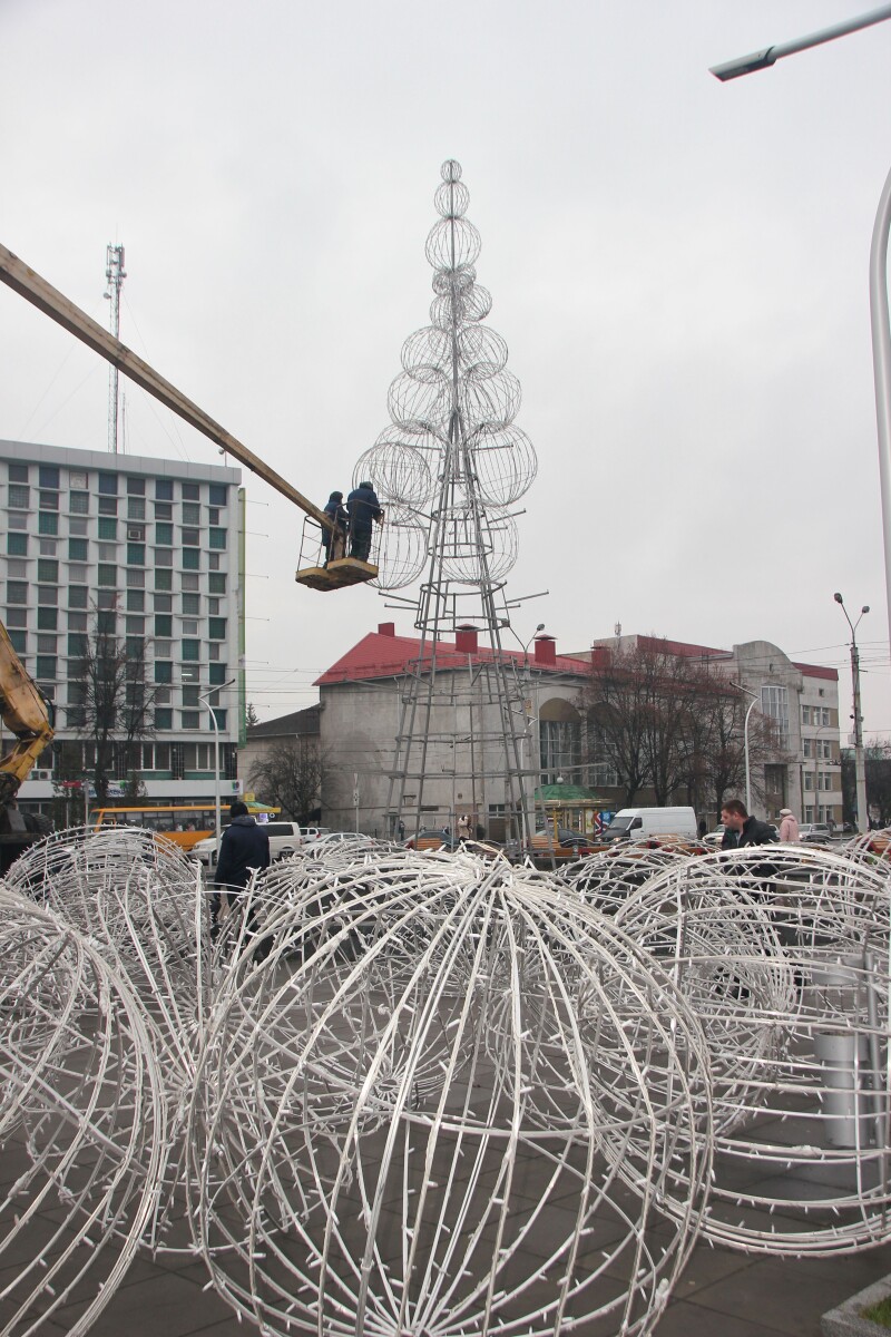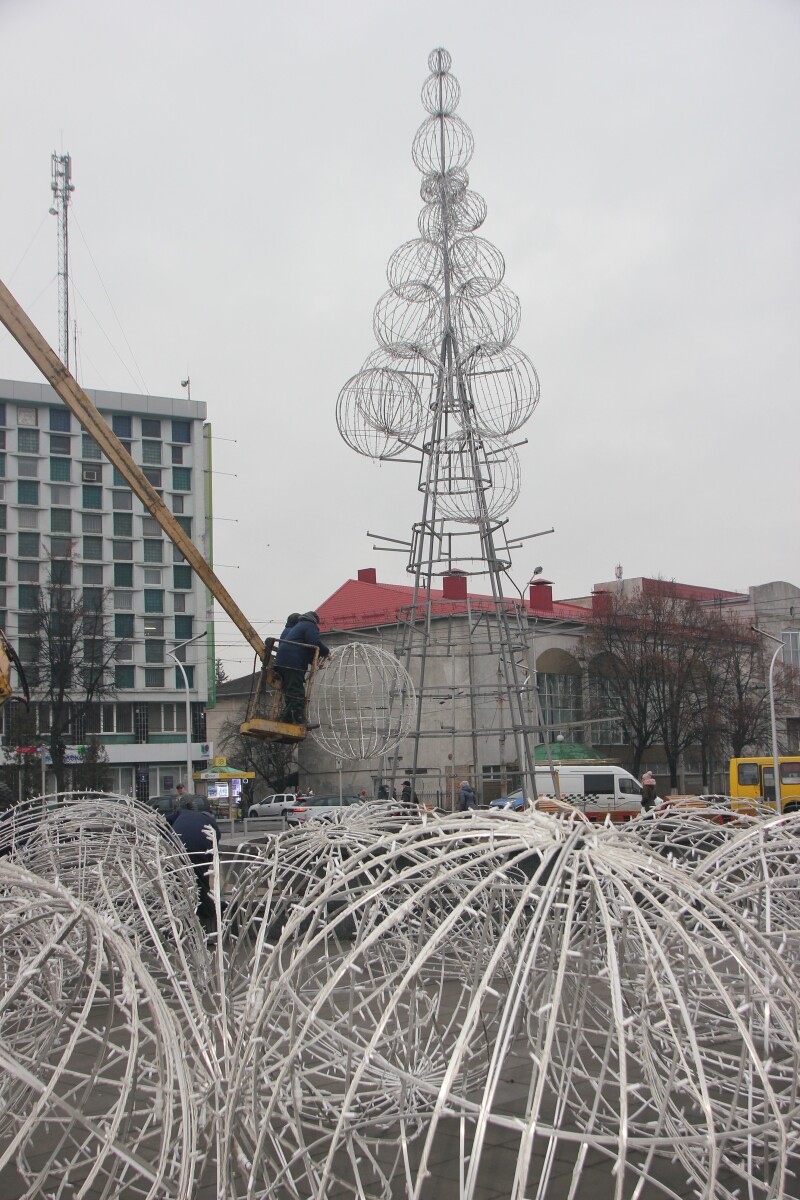 Роботи над її встановлення цьогоріч почалися раніше звичайного: ще 27 листопада робітники встановили каркас, на якому кріпитиметься металева конструкція, а сьогодні, 28 грудня, до каркасу приєднують гігантські кулі. Працює п'ятеро робітників, двоє, яких підіймає кабіна, подають кулі на верхівку, водій керує стрілою, ще двоє складають конструкції знизу. Отож робота кипить.
