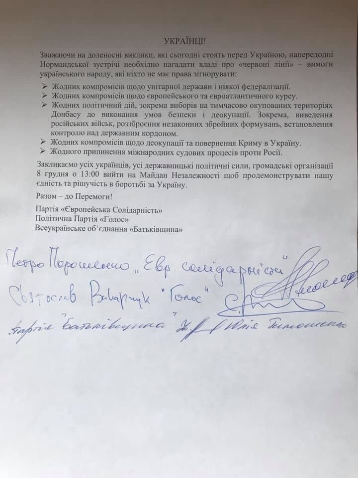 Зважаючи на доленосні виклики, які сьогодні стоять перед Україною, напередодні Нормандської зустрічі необхідно нагадати владі про «червоні лінії» – вимоги українського народу, які ніхто не має права зігнорувати: