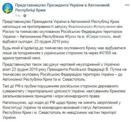 «Представництво також засуджує черговий неузгоджений з Україною візит 23 грудня 2019 президента Російської Федерації Володимира Путіна на тимчасово окуповану територію України - в Автономну Республіку Крим і Севастополь. Такі дії РФ є грубим порушенням російською стороною державного суверенітету і територіальної цілісності України, нехтуванням Кремлем загальновизнаних принципів і норм міжнародного права», - йдеться в повідомленні.