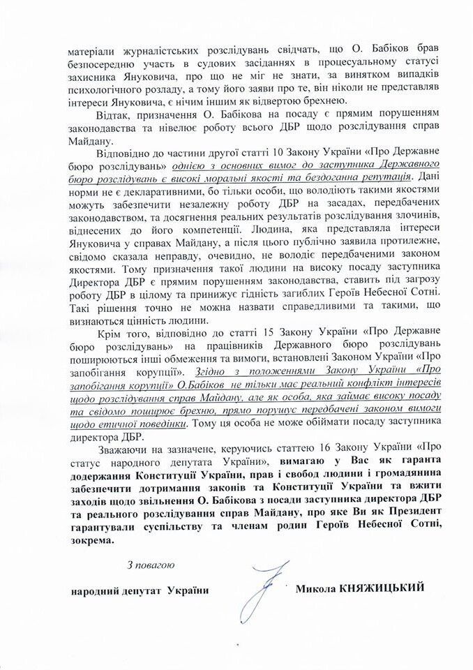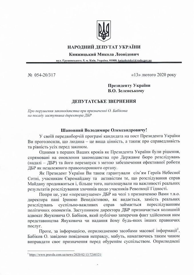 Про це на своїй сторінці у мережі Facebook пише народний депутат з фракції «Європейська Солідарність» Микола Княжицький. Він повідомив, що надіслав відповідне звернення до президента Зеленського щодо порушення законодавства при призначенні Бабікова на посаду першого заступника директора ДБР. Княжицький, зокрема, посилається на журналістське розслідування програми «Слідство. інфо», яке доводить активне залучення Бабікова до захисту Януковича.