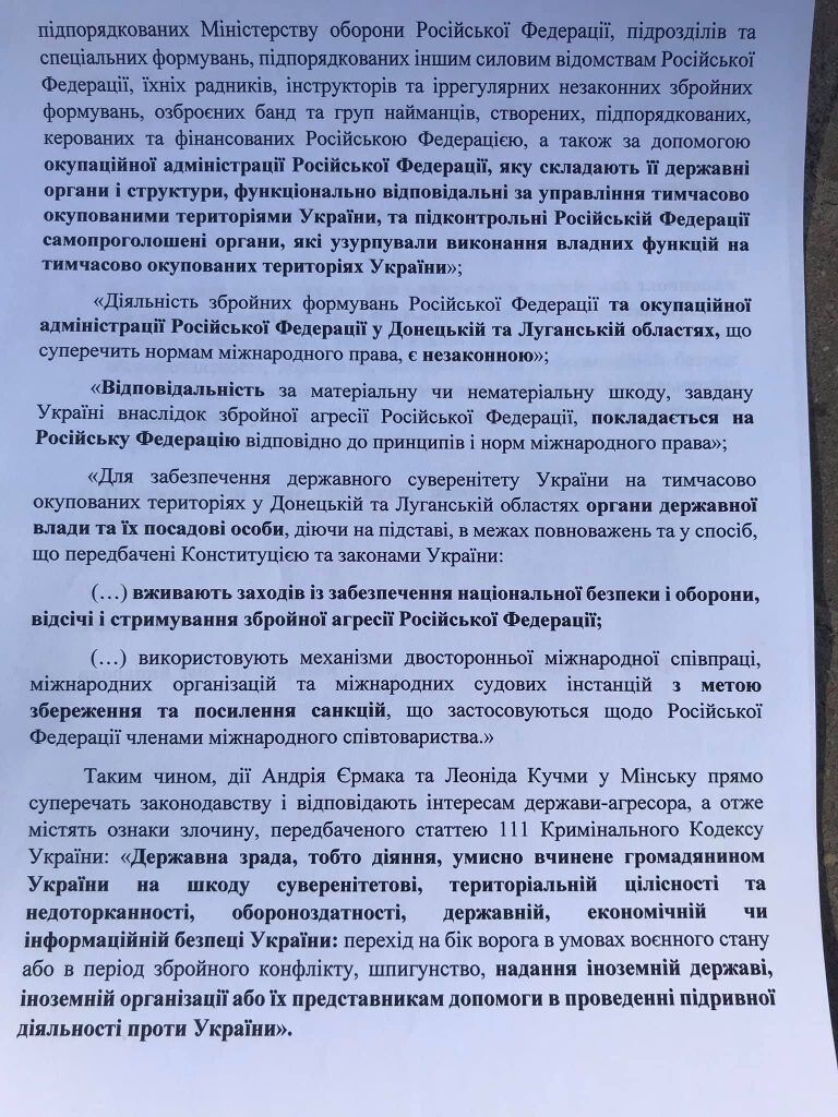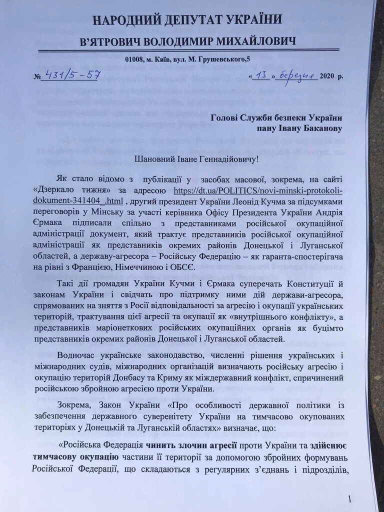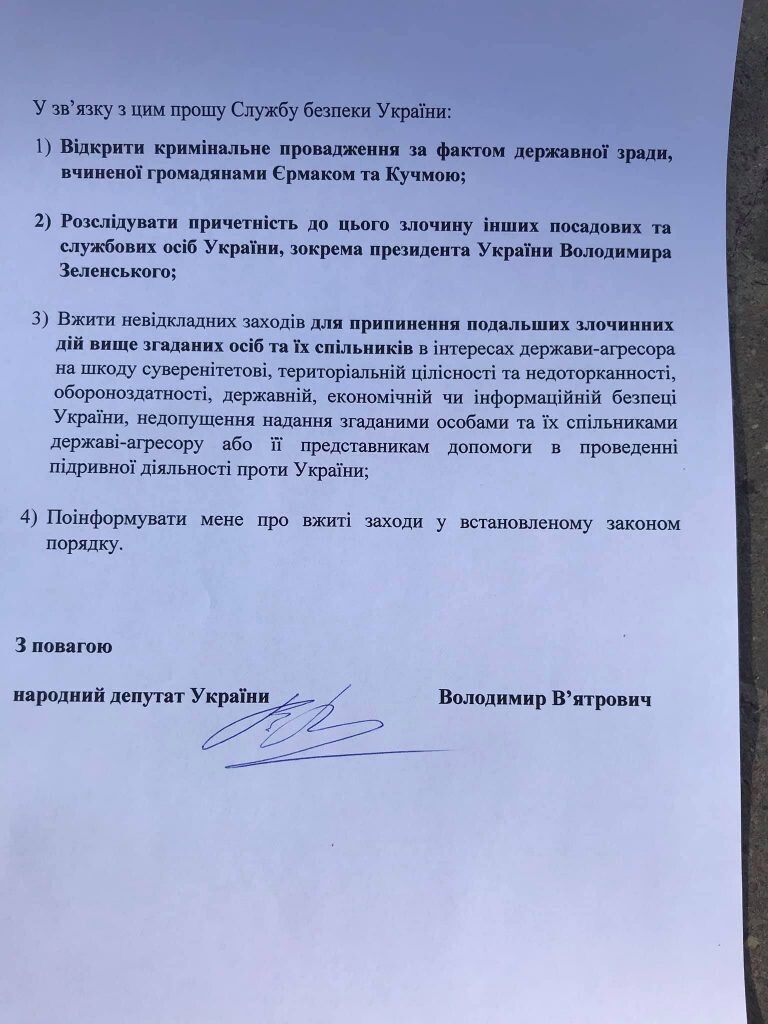 Володимир В’ятрович звернувся до Служби безпеки України, Національного антикорупційного бюро і Державного бюро розслідувань з вимогою перевірити дії глави Офісу президента Андрія Єрмака і другого Президента України, представника в тристоронній контактній групі в Мінську Леоніда Кучми на можливий факт державної зради через підписання ними документу, який фактично визнає на державному рівні ОРДЛО