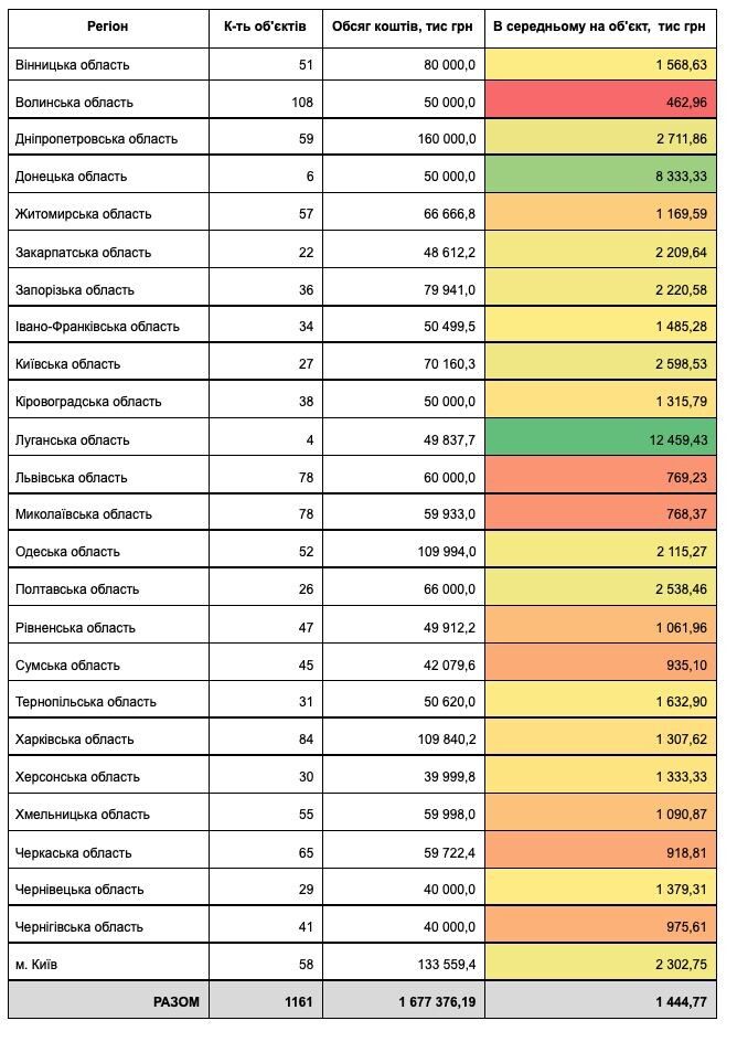 При цьому, відрізняється середній обсяг на один проєкт у різних областях: найменший у Волинській області (менше півмільйона грн на об’єкт), найбільший на Луганщині – 12,5 млн грн на об’єкт.