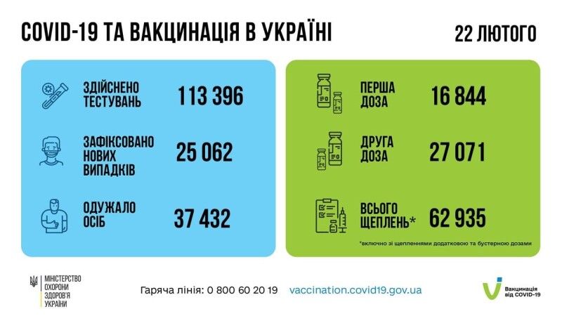 За добу 22 лютого в Україні зафіксовано 25 062 нових підтверджених випадків коронавірусної хвороби COVID-19 (з них дітей – 2 427, медпрацівників – 665)