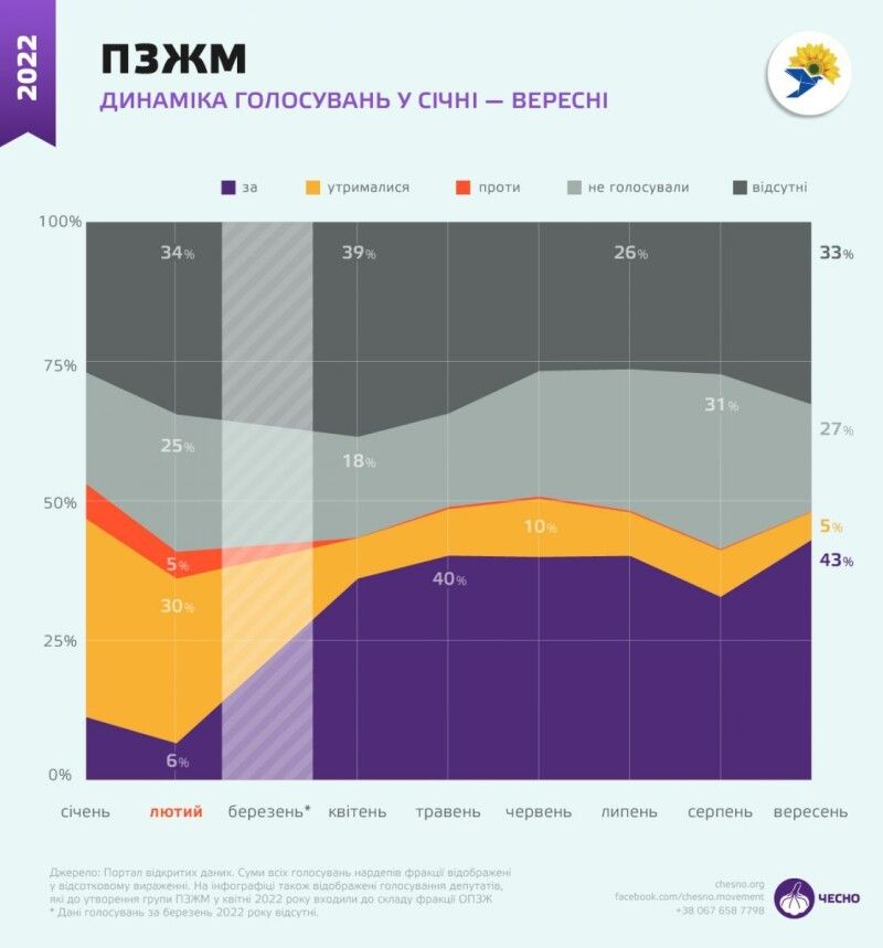 Однак після повномасштабної агресії росії та заборони партій все кардинально змінилось, у представників ОПЗЖ запрацював інстинкт самозбереження, і вони почали перевзуватись на ходу. В парламенті депутати змінили риторику та почали систематично голосувати за. Підтримка голосувань за представниками ОПЗЖ росла і після формального перегрупування та оголошення наприкінці квітня про створення групи ПЗЖМ.
