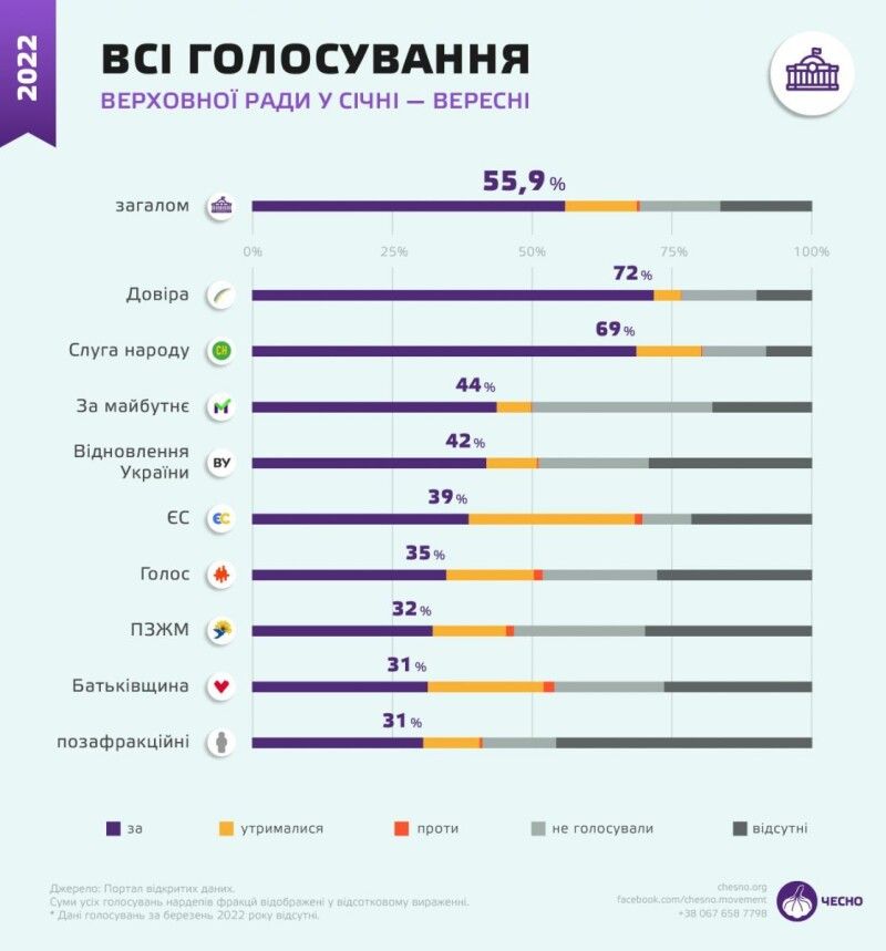 Якщо раніше монокоаліцію «Слуги народу» у ВРУ з голосами «підстраховували» дві депутатські групи — «Довіра» та «За майбутнє», а в перші місяці після вторгнення спостерігався певний консенсус та злагодженість між владою та опозицією, то зараз голосування у Раді не проходять без системної підтримки депутатських груп з колишньої ОПЗЖ. Про це йдеться у аналізі Руху ЧЕСНО голосувань Верховної Ради від початку 2022 та до початку нового політичного сезону у вересні, передає Цензор.НЕТ.
