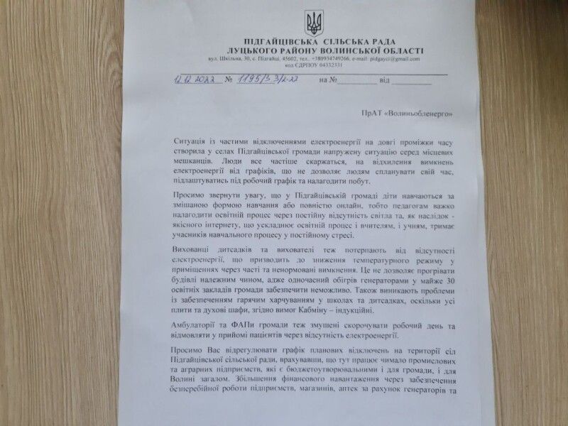 Просимо Вас відрегулювати графік планових відключень на території сіл Підгайцівської сільської ради, врахувавши, що тут працює чимало промислових та аграрних підприємств, які є бюджетоутворювальними і для громади, і для Волині загалом. Збільшення фінансового навантаження через забезпечення безперебійної роботи підприємств, магазинів, аптек за рахунок генераторів та спалювання великої кількості пального, негативно вплине на формування цін на продукцію та послуги для населення.