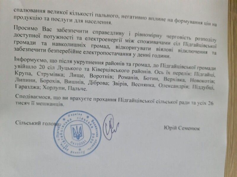Просимо Вас забезпечити справедливу і рівномірну черговість розподілу доступної потужності та електроенергії між споживачами сіл Підгайцівської громади та навколишніх громад, відкоригувати віялові відключення та забезпечити безперебійне електропостачання у денні години.