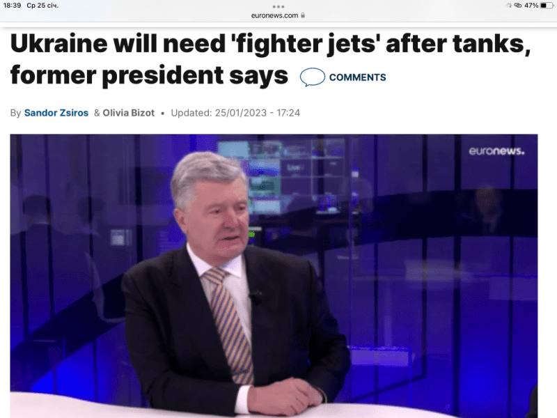 Петро Порошенко в ефірі Euronews заявив, що рішення західних партнерів надати Україні танки вкрай важливе, але ЗСУ потрібні також реактивні винищувачі. За словами п’ятого Президента, вже зараз союзники мають розпочати підготовку українських пілотів, щоб вони якомога швидше могли освоїти натівські літаки.