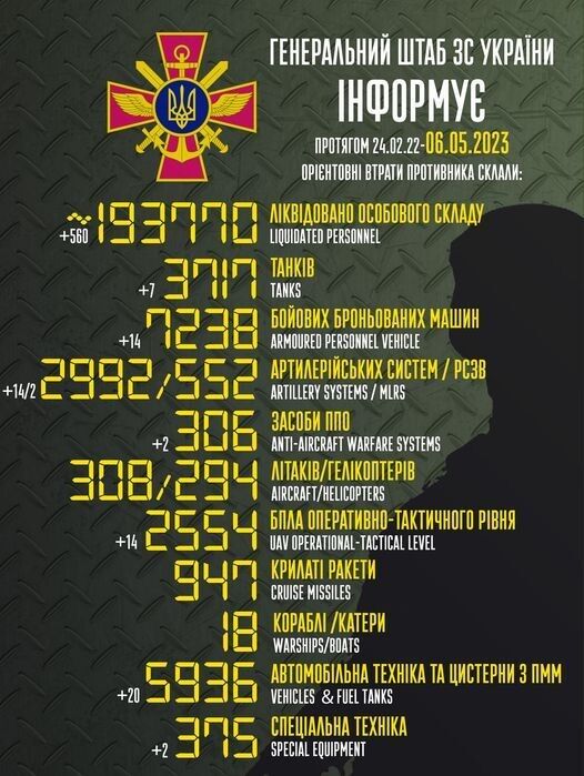 Загальні бойові втрати противника з 24.02.2022 по 6.05.2023 орієнтовно становили: