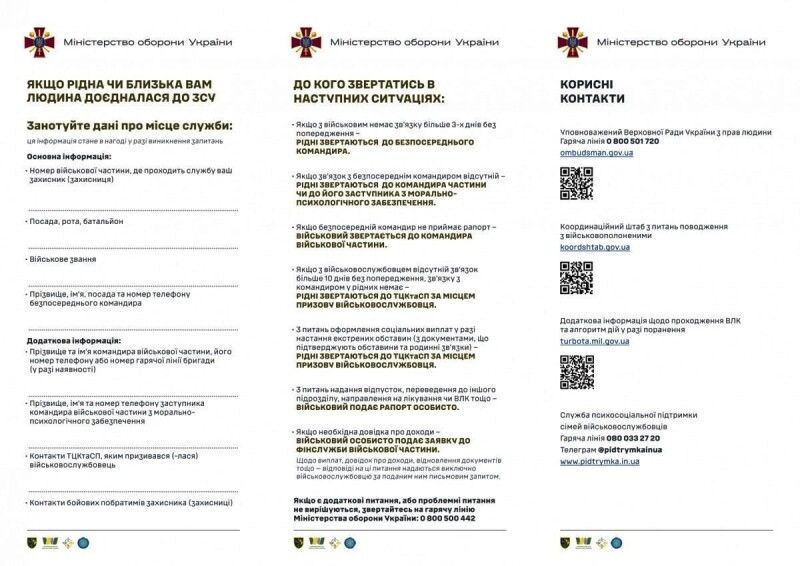 Родичі військових у буклеті можуть власноруч заповнити дані про захисників та захисниць, мати перелік основних контактів, за якими слід звертатися у різних ситуаціях, що можуть виникнути.