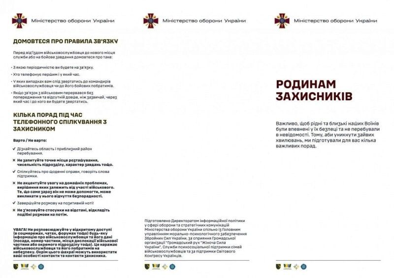Міністерство оборони України презентувало брошуру «Родинам захисників», яка покликана розʼяснити, як запобігти стресовим ситуаціям у родинах захисників і захисниць та поінформувати членів сімей військових про канали комунікації із ЗСУ.