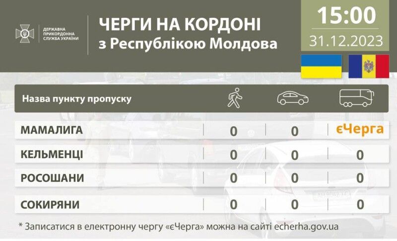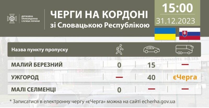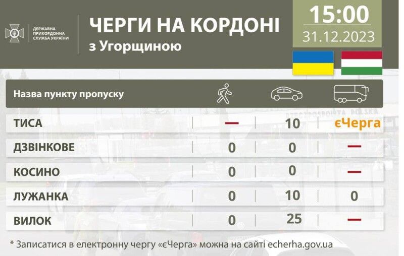Державна прикордонна служба опублікувала інформацію про стан черг перед пунктами пропуску на виїзд з України станом на 15:00 31.12.2023 року.