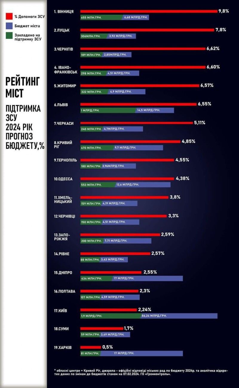 «Саме у % чітко зрозуміло, хто на скільки допомагає, виходячи, із своїх можливостей, - пояснює активіст. - Звісно, написали тут і загальну суму допомоги та загальний бюджет міст. Для розуміння повної картини. Суми витрат рахували, виходячи із бюджетів профільних програм підтримки ЗСУ(десь їх декілька) та офіційних відповідей міських рад. Вони можуть розходитись із цифрами у ЗМІ, адже між словом мерів та їх обіцянками і ділом не завжди знак рівності».