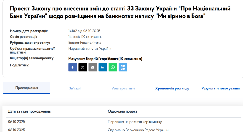 На сайті Ради з'явився проєкт закону про внесення змін до статті 33 «Про Національний банк України» щодо розміщення на банкнотах напису «Ми віримо в Бога». Ініціатором виступив нардеп Георгій Мазурашу. Про це повідомляє «Главком» з посиланням на картку законопроєкту.