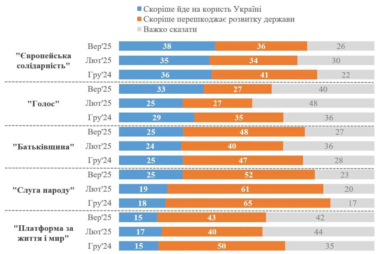 Таке ж питання соціологи ставили респондентам у грудні 2024 року і лютому 2025 року. КМІС ставив запитання, чи діяльність фракції скоріше йде на користь України, чи скоріше перешкоджає розвитку держави? У вересні 2025 року соціологи повторно поставили це запитання респондентам.