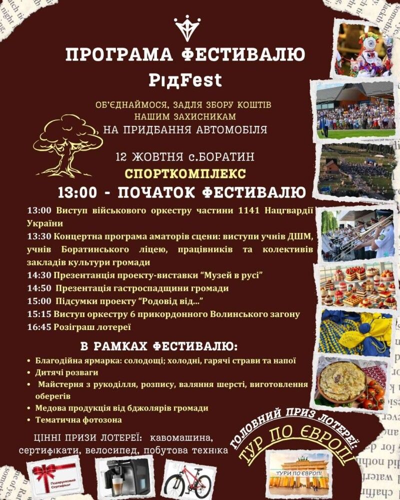 «12 жовтня о 13:00 на території спорткомплексу села Боратин відбудеться благодійний фестиваль «РідFest». Подія, яка об’єднає громаду задля доброї мети — збору коштів на придбання автомобіля для наших захисників.
