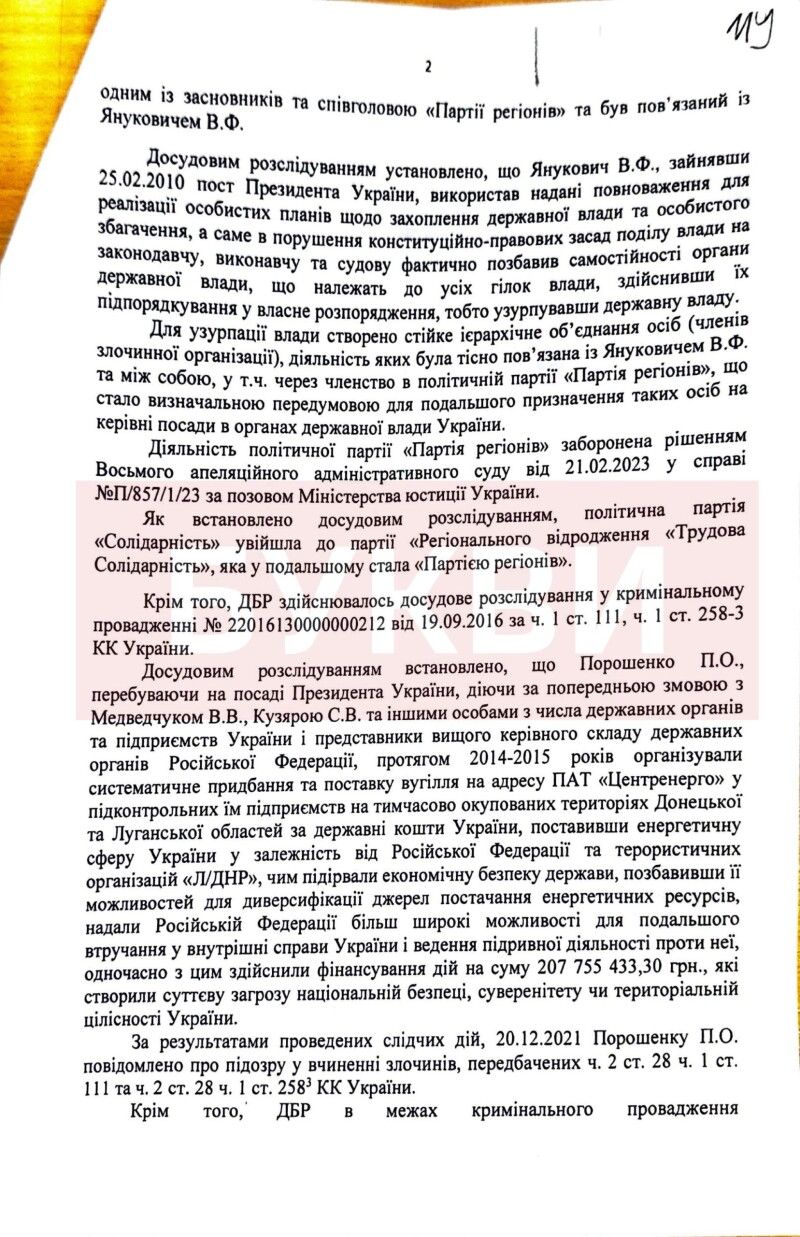 2) Участь у «вугільній справі», в якій ДБР звинувачує Порошенка в тиску на уряд, щоб той закупив вугілля для забезпечення опалювального сезону 2014-2015 року в «Л/ДНР». Фактично, тоді уряд придбав вугілля, в українських компаній, які управляли шахтами, розташованими на окупованій частині території сходу України. Для цього було передбачено окрему процедуру, за якою компанії перереєструвались на вільній території України, вугілля поставлялось напряму на електростанції, а кошти за нього надходили на зарплату шахтарям. У наступні роки ТЕС переобладнали на інші види вугілля, що дозволило зменшити залежність від вугілля з окупованих територій, яка на 2014 рік була стовідсотковою. Станом на жовтень 2025 року жодних вироків у цій справі винесено не було.