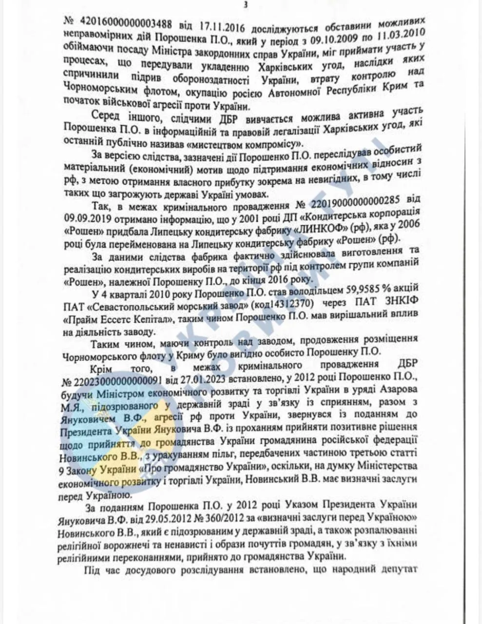 - сприяння наданню громадянства Вадиму Новинському у 2012 році, коли Порошенко очолював Міністерство економічного розвитку.