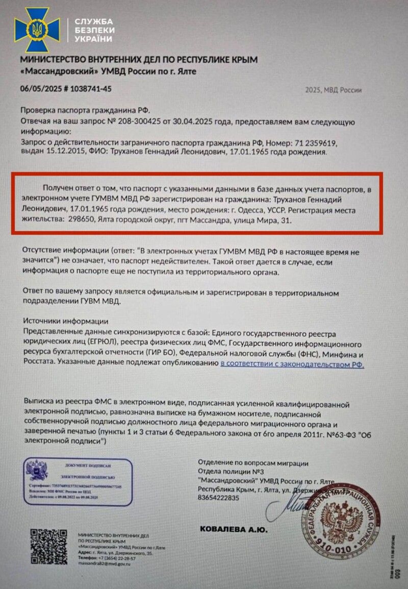 За інформацією СБУ, Геннадій Труханов є громадянином РФ і має чинний закордонний паспорт країни-агресора