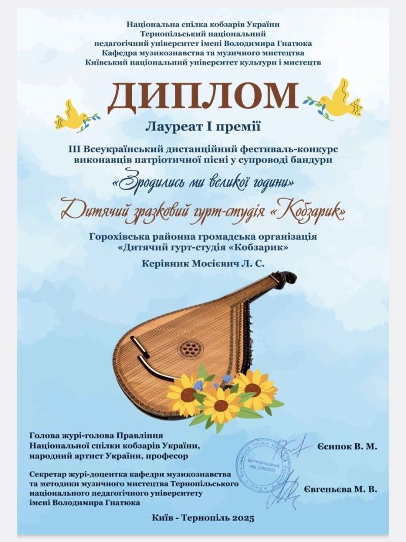 «У найпрестижнішому і масштабному Всеукраїнському дистанційному фестивалі-конкурсі виконавців патріотичної пісні у супроводі бандури «Зродились ми великої години», проведеного під егідою Національної спілки кобзарів України, «Кобзарик» визнаний переможцем за виконання пісні «Йшли селом партизани».