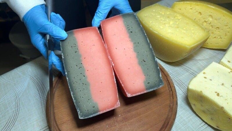 Серед найулюбленіших сирів, які виготовляє, каже Сергій, його авторський — «Бандерівський». Його й розмалював відповідними кольорами — частина чорна, пофарбована чорнилом каракатиці, а інша частина — червона. Цей сир готують і витримують впродовж 90 днів.