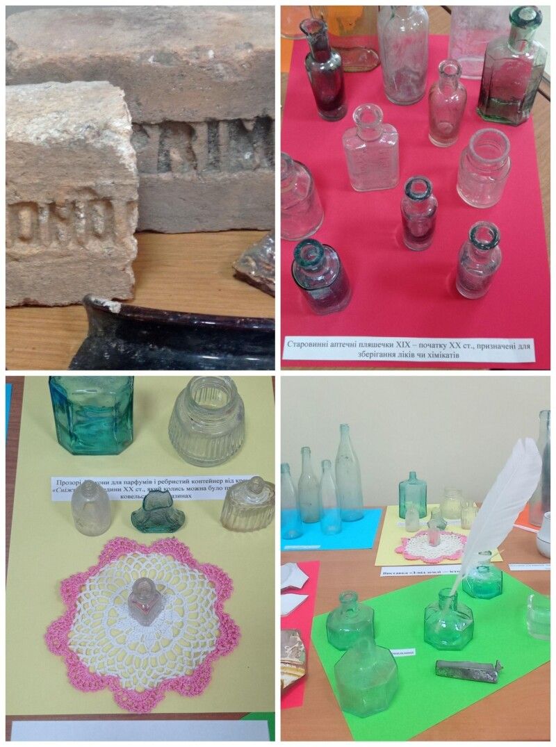 - аптечні пляшки з рельєфним тисненням, виготовлені у кінці XIX – на початку XX століття; чорнильниці і сільничка;