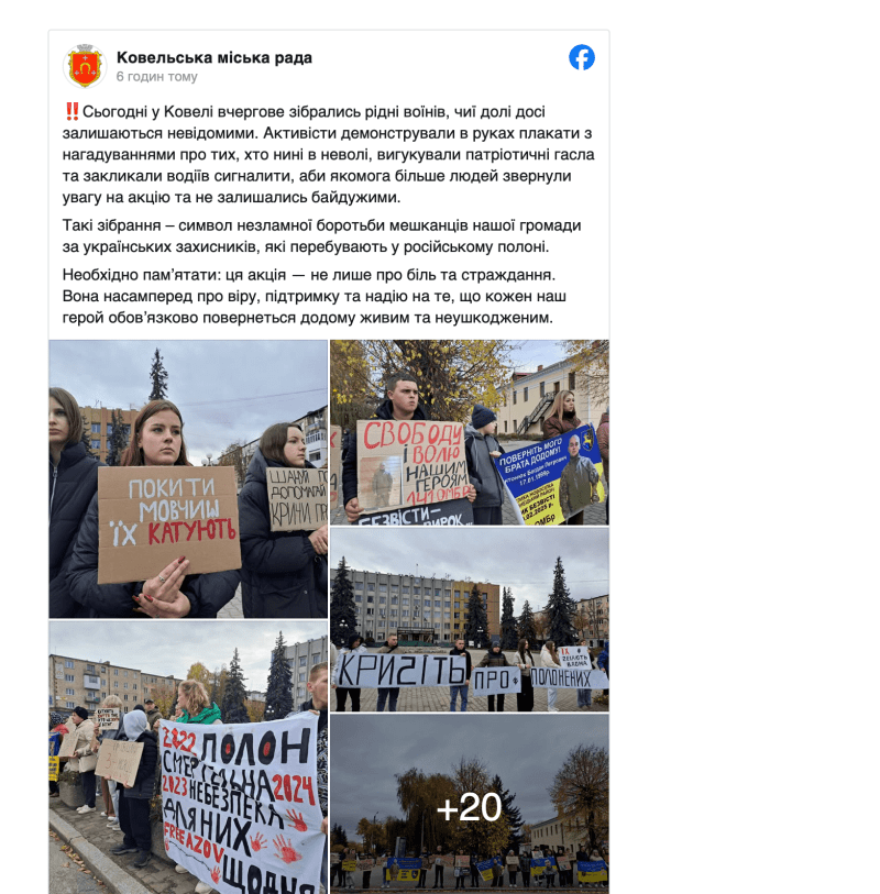 У Ковелі рідні, друзі, знайомі та небайдужі зібралися у центрі міста. Люди у руках тримали плакати із закликами звільнити полонених та світлинами тих, хто зник під час бойових дій на фронті, повідомили в Ковельській міській раді.
