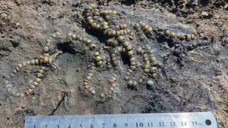 Команда знайшла скляне намисто з 288 округлих намистинок жовто-бурштинового та 1 ніжно-голубого кольору. Його довжина 120 сантиметрів, а вага — 103 грами.